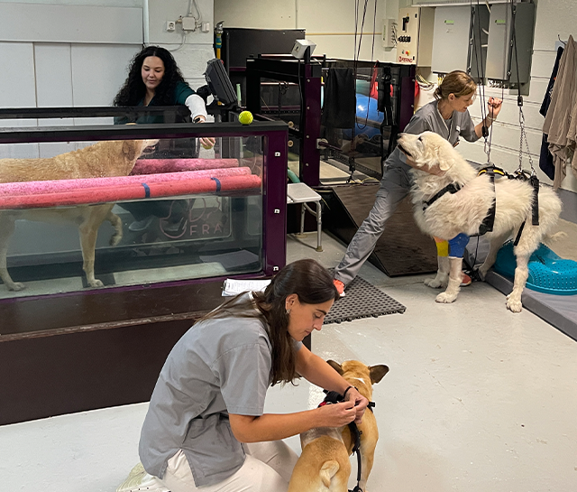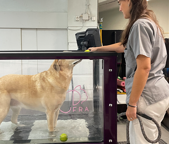 A Hidroterapia é um dos tratamentos que pode melhorar a qualidade de vida do melhor amigo. No Centro FRA temos 2 passadeiras aquáticas, uma para animais de raça gigante que tem possibilidade de suporte de animais paralíticos de raça gigante por grua, e outra para gatos e cães pequenos que pode ajudar em situações de falta de mobilidade ou excesso de peso.